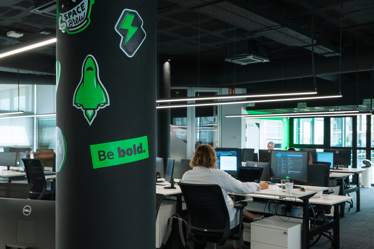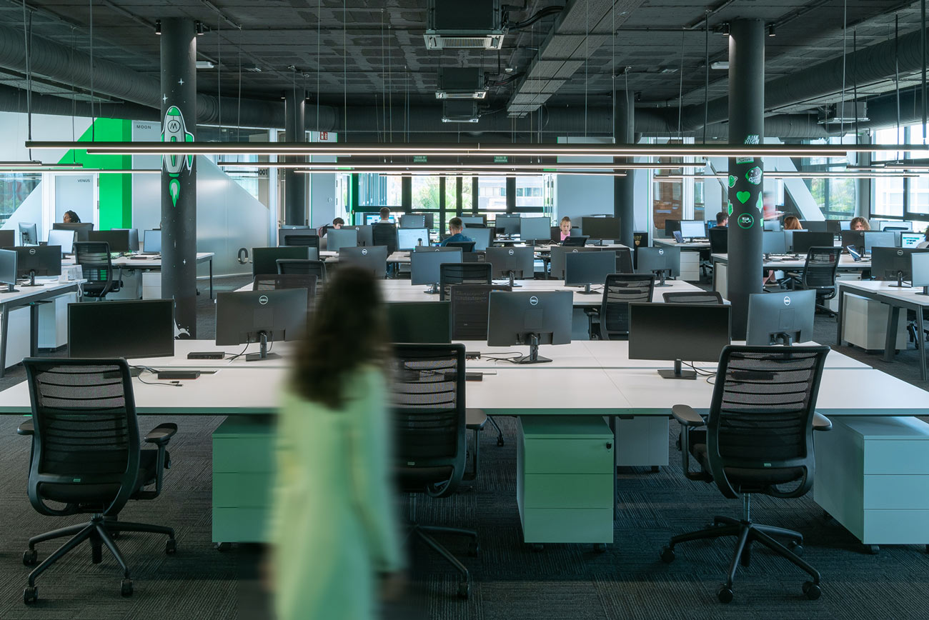 So my concept started focusing on a few ideas, starting with the green neon color that reminds me to technology and also space, following with the employees, young people aiming high, fresh and wanting to reach the highest, this reminded me of the figure of an astronaut.